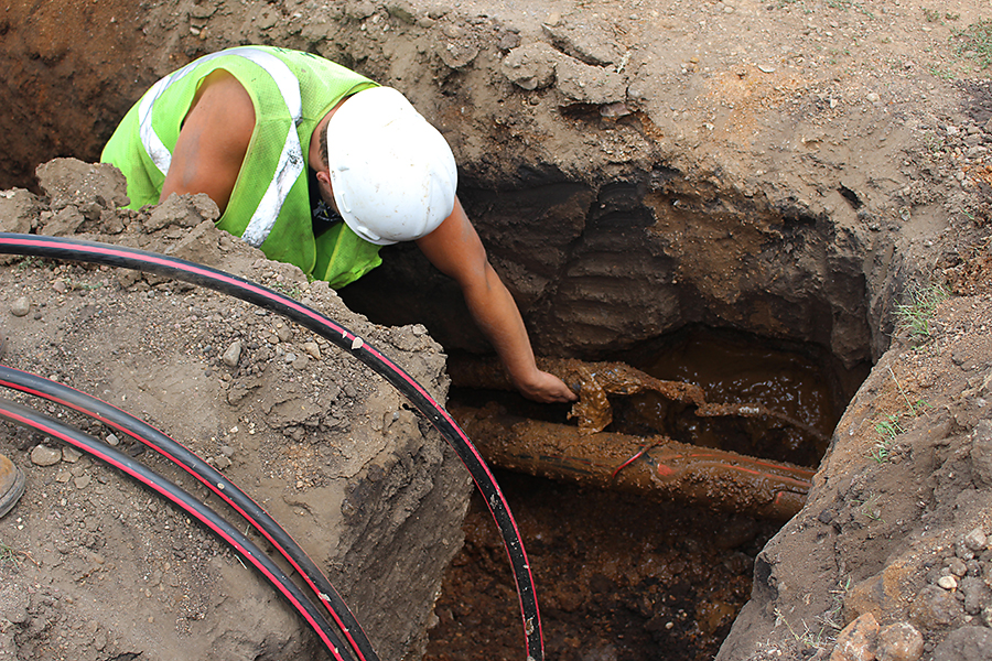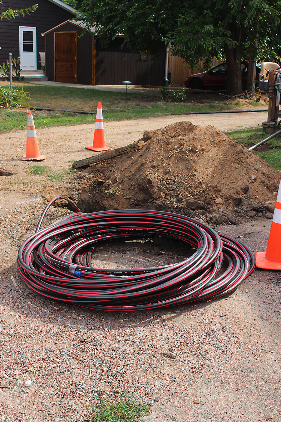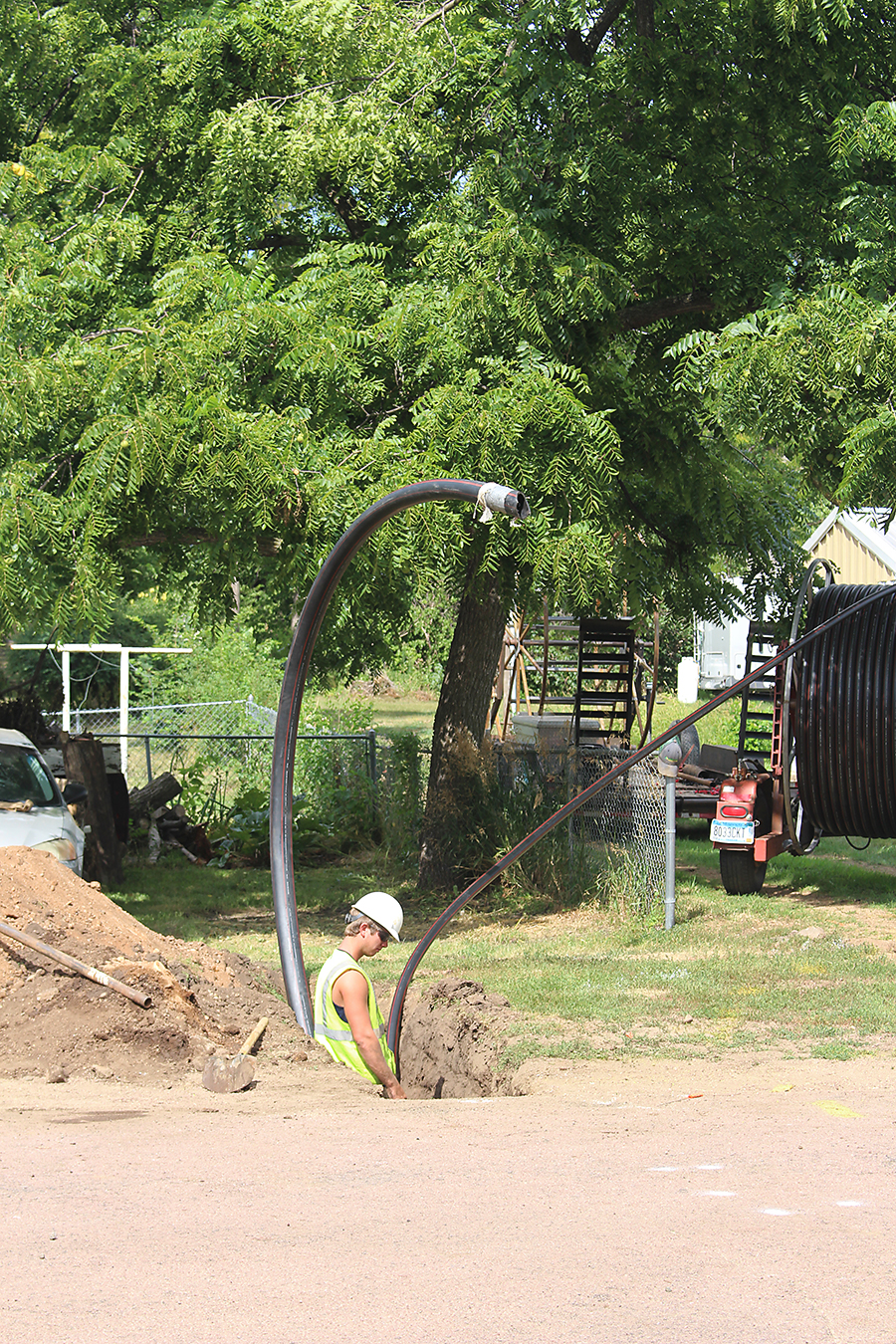 Pictured below: On July 28, the contractors prepared to bore line beneath one particular street and had to avoid fiber optics cable, sewer line, two natural gas lines and two phone lines.
